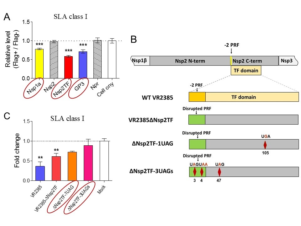PRRSV reportedly down-regulates SLA-I (porcine MHC class I) expression as a strategy for immune evasion. After we independently confirmed that indeed PRRSV (strain VR2385) inhibited the surface expression of SLA-I in infected cells, we aimed to delineate the underlying mechanism, particularly what PRRSV viral component(s) is responsible for the SLA-I down-regulation. To ensure we examine all possibilities, we had to clone, express and screen every single PRRSV structural and non-structural proteins. The initial screening identified 3 proteins (Nsp1α, Nsp2TF and GP3) that down-regulate SLA-I. Interestingly, a newly discovered PRRSV nonstructural protein (Nsp2TF) with essentially unknown function was found to have the greatest reduction of SLA-I expression. This is particularly exciting since, unlike the other two negative modulators (Nsp1α and GP3), the novel Nsp2TF gene can be silenced in the virus without affecting the virus’s viability since it is produced by a unique -2 ribosomal frameshifting mechanism that depends on a conserved frameshifting sequence within the viral RNA. Therefore, we reason that if we abolish the Nsp2TF in the virus, the mutant would still be viable but lose its ability to down-regulate SLA-I, and thus this will verify our finding about the novel role of Nsp2TF in SLA-I down-regulation. However, we found that a mutant virus with a scrambled frameshifting sequence that does not express Nsp2TF still down-regulated SLA-I. This led us to question whether it is sufficient to fully abolish the Nsp2TF expression with disruption only in the frameshifting sequence. Subsequently we generated two mutants with additional stop codons introduced in the TF domain of the Nsp2TF, and we found that indeed these two new mutants lost their ability to down-regulate SLA-I while the Nsp1α and GP3 were still expressed by the virus.