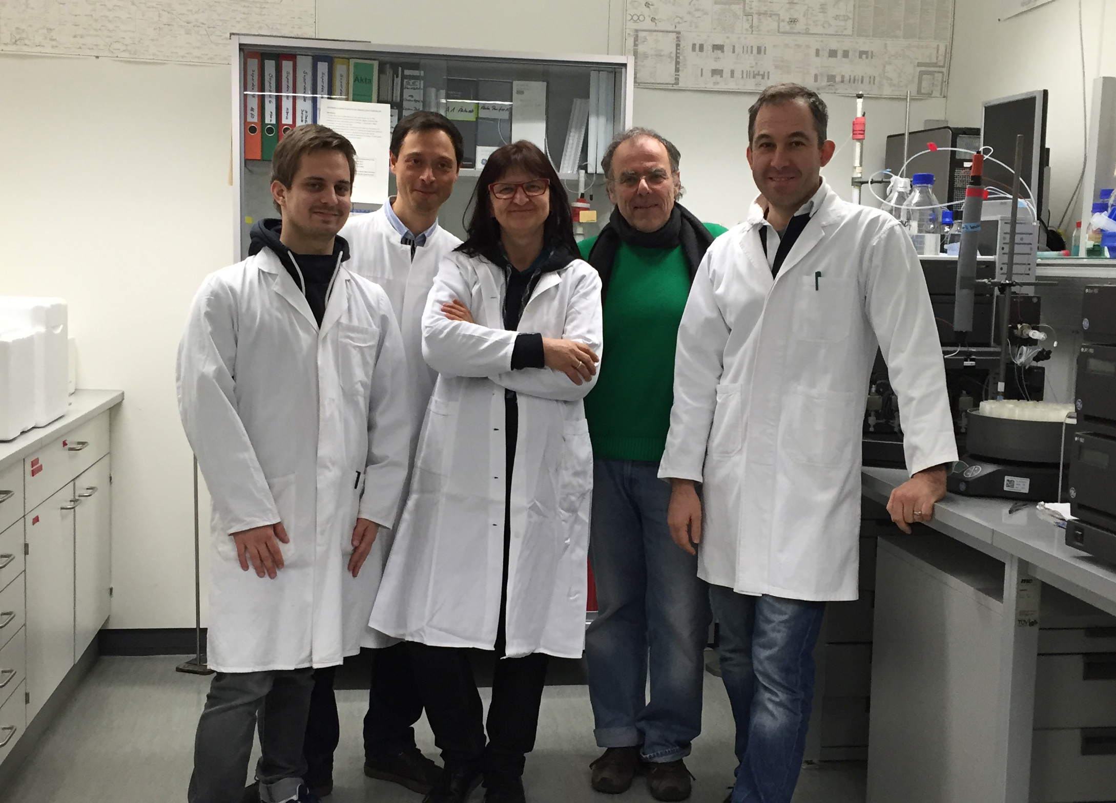 While working on this exciting project, Domenico had observed that two of these proteins spontaneously form a 2:1 complex. Sebastian looked into the folding of each of these proteins and was stunned by their refolding capacities, explaining how the proteins are able to exit the phage head and form the ejectosome. Max checked the structure of the complex by electron microscopy and we were amazed to see spiral filaments that looked very different from the structures these proteins appear inside the phage capsid. Gisela found that the complex of the two proteins binds to protein-free liposomes and DNA, explaining how they might bind the host membrane and allow the transport of the phage genome into the host cell.