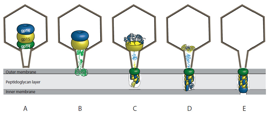 This work started decades ago when the senior author Andreas Kuhn was a young PhD student and some authors were still crawling around in diapers. In Rudi Hausmann’s and Ed Kellenberger’s labs, Andreas discovered the importance of the T7 phage gene 16. Without it, the phage lost its ability to assemble progeny in the host cells and aberrant empty capsids appeared inside the cells visualized by electron microscopy. It is fascinating, that in the center of the capsid, the phage carries syringe components to inject DNA into the host. It doesn’t have them pre-assembled ready for injection by simply extending a drill into the host cell; no, it carries a nicely packed parcel of the drill proteins tightly packed in a structure called the “inner core”. It is like a parcel from IKEA that -with the proper manual- allows you to build a piece of furniture. The phage has no manual, but still, a complex called the ejectosome is assembled in the host cell wall. This was one of our major questions: How does the phage assemble the DNA channel?