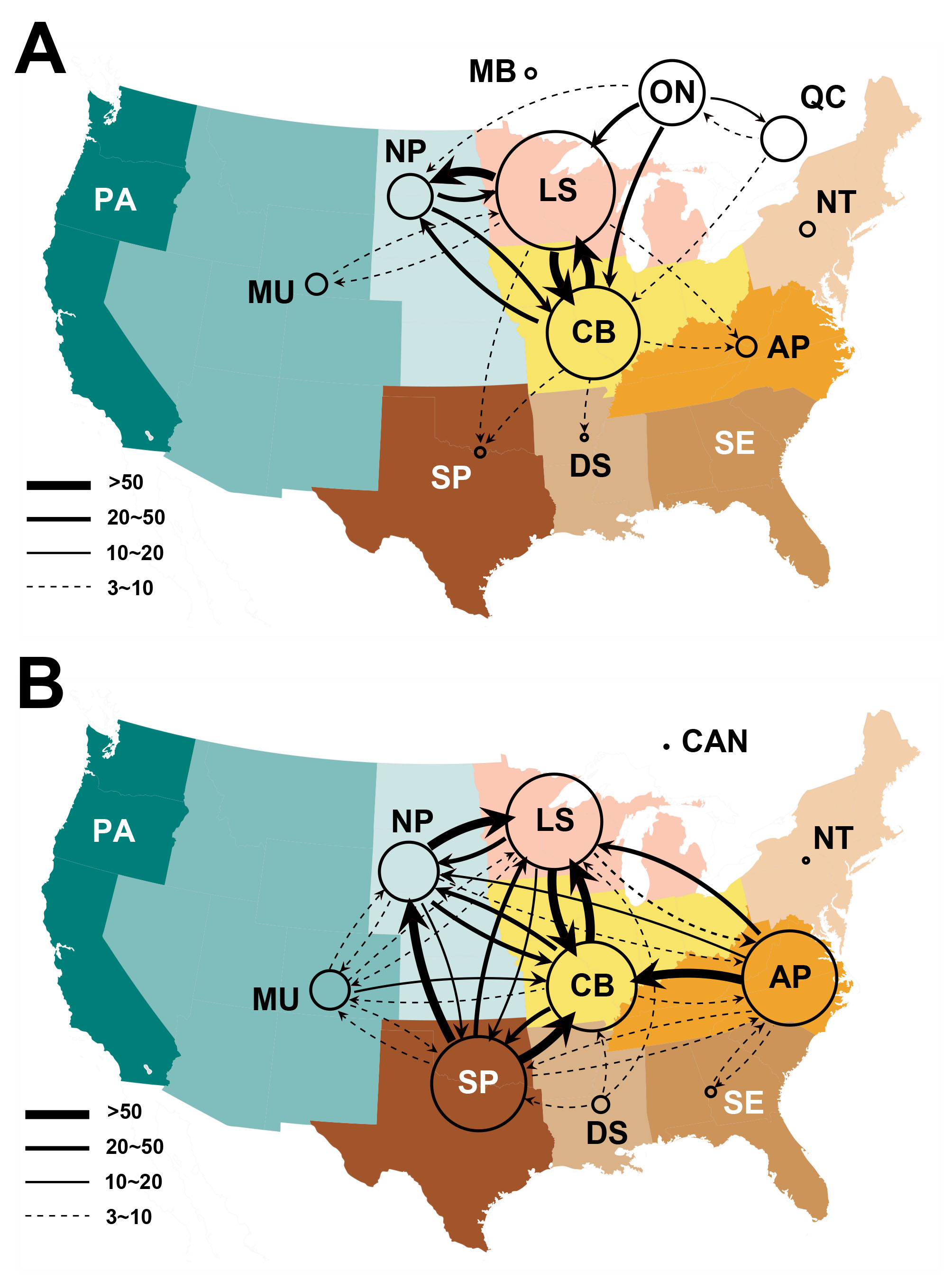 Our study employed state-of-the-art phylogeographic analyses on 7040 ORF5 gene sequences to reveal the recent geographical expansion history of Type 2 PRRSV in North America. Particularly, our results demonstrated multiple viral introductions from Canada to the United States driven by the unidirectional transportation of feeder pigs across the border. As a result, Canadian-like PRRSVs have been gradually replacing endemic viral populations as the dominant variants in the Midwest regions of the United States. Furthermore, our study underscores hog transportation as the key factor contributing to large-scale virus movement. Indeed, the directions and intensities in our reconstruction of virus traffic network was almost a mirror image of hog transportation in North America.