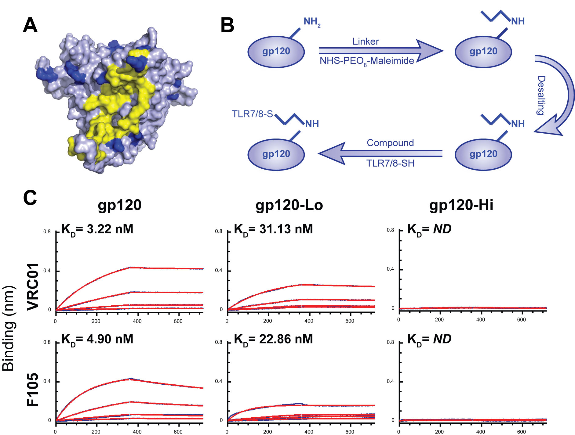 In our current study, we conjugated a TLR7/8 ligand to lysine residues on the surface of the glycoprotein. We joined the ligand to the lysine residues using NHS-PEO8-maleimide linkers. We then investigated if this modification affected antibody recognition, primarily at the highly conserved primary receptor CD4 binding site (CD4bs), which is a well-defined target for HIV-1 bNAbs.