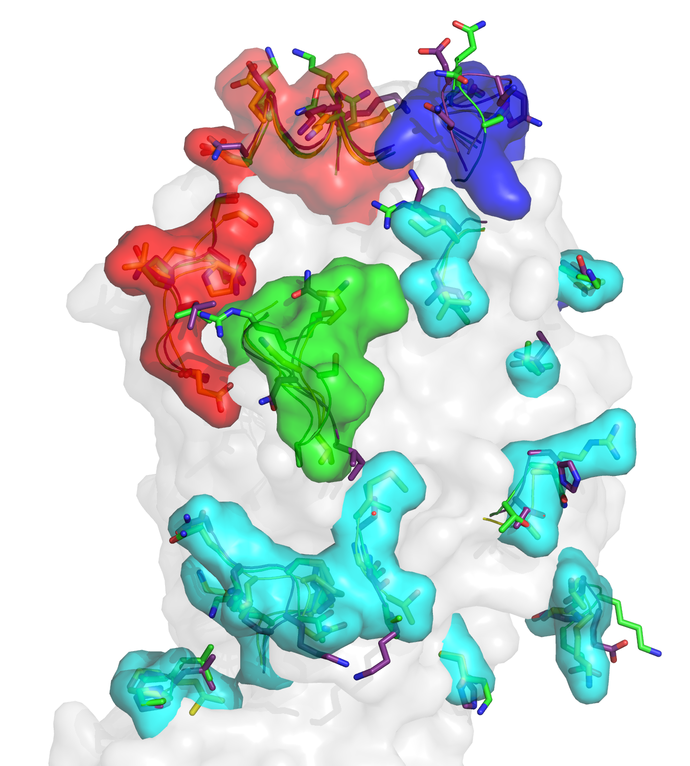 Surface presentation of the globular domain of B/Yamanashi/98 HA highlighting the four major epitopes (120-loop region in cyan, 150-loop in green, 160-loop in blue and 190-helix region in red).  Main-chain traces are shown for residues with large changes among different HA structures while side-chain atoms are shown for amino-acid substitutions in B/Brisbane/08 HA (purple), B/Yamanashi/98 HA (green) relative to B/HK/73 HA (yellow).