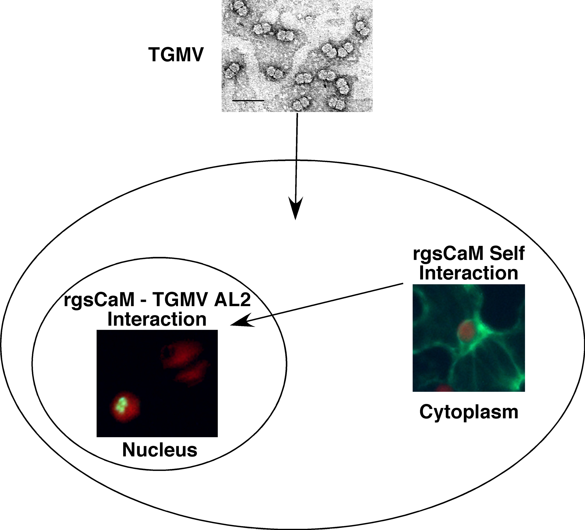 When Tomato golden mosaic virus (TGMV) enters the cell and initiates an infection, the production of AL2 leads to relocalization of rgsCaM from the cytoplasm to the nucleus.