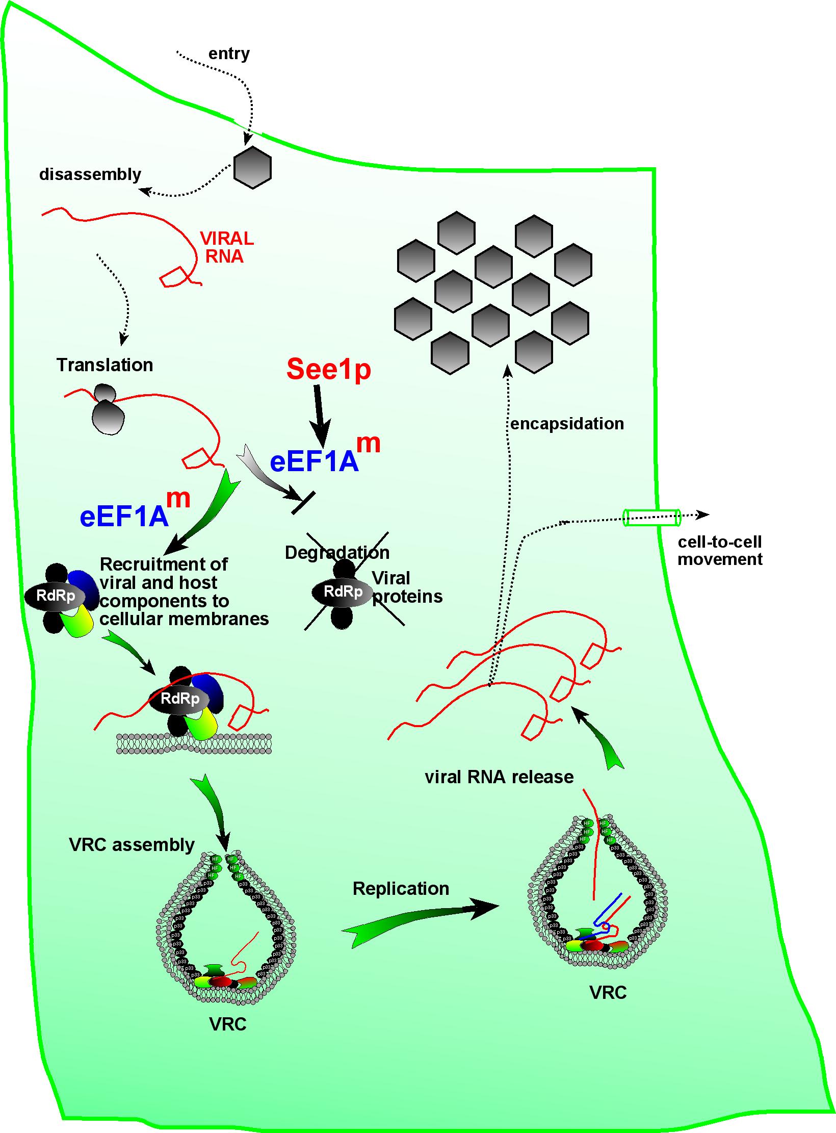 The role of See1 methyltransferase and eEF1A in tombusvirus replication in host cells. The viral infection cycle is shown as progresses in the infected cells. See1 methyltransferase methylates eEF1A translation factor, which then prevents the degradation of the viral replication proteins and promotes their use in the assembly of the viral replicase complex (VRC).