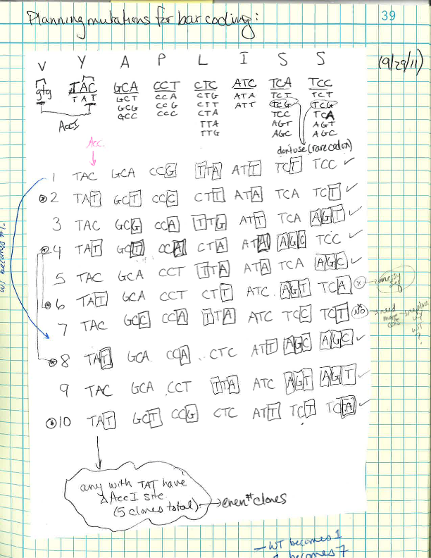 Notebook page showing design of silent point mutation markers in the M1 segment of the reovirus genome.